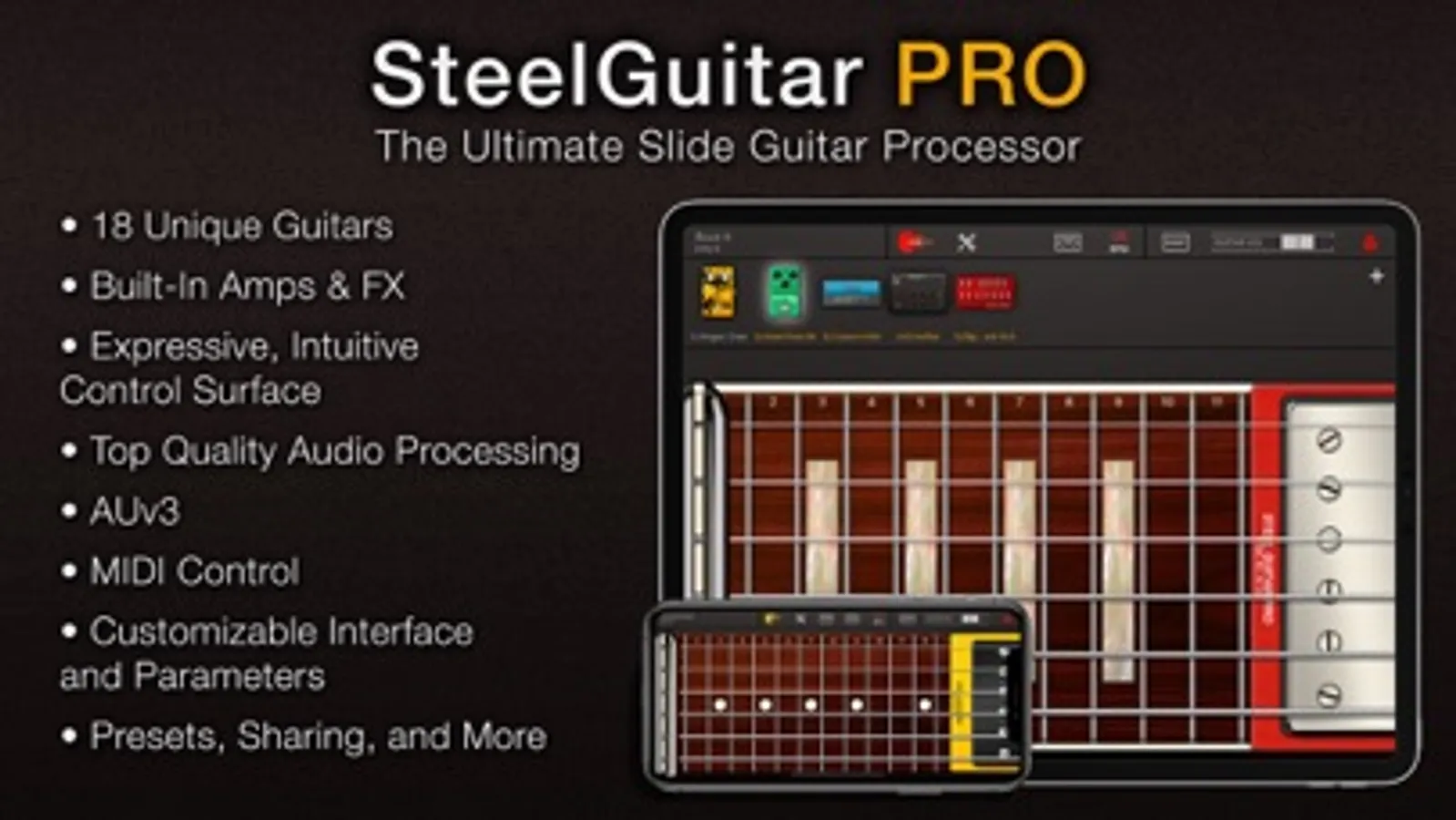 Steel Guitar PRO is a highly advanced guitar processor that combines cutting-edge realtime audio generation with a truly expressive control interface. It provides many unique guitar models, built-in amps & FX processing, MIDI control, AUv3, and wide-ranging customizability.
