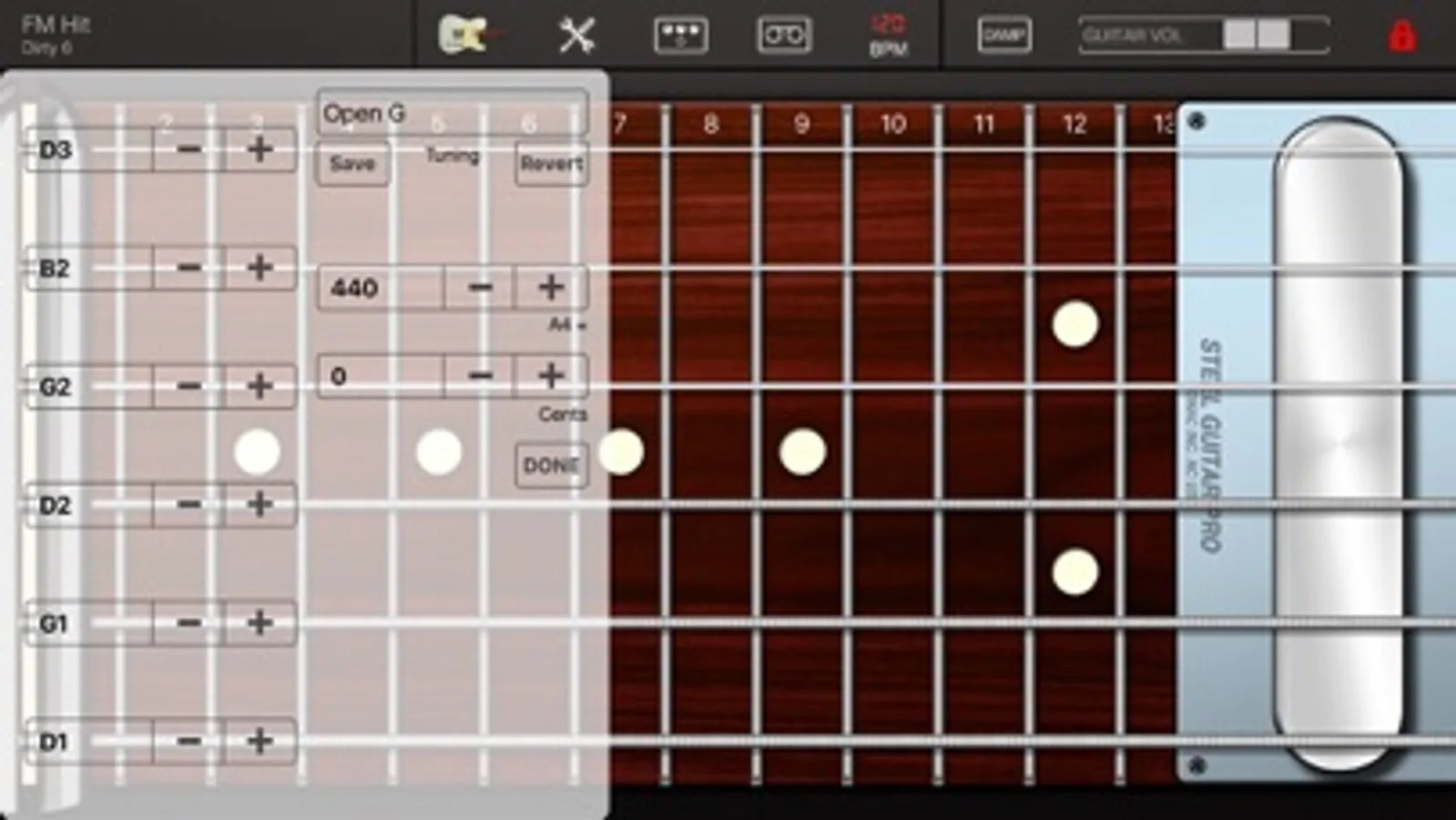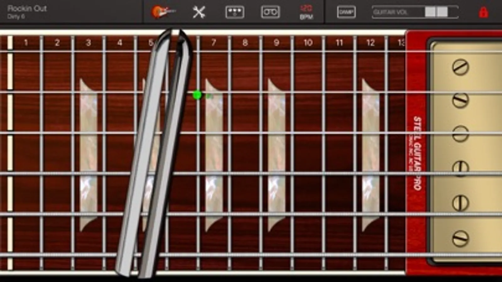 Steel Guitar PRO features a powerful yet familiar control interface. Simply touch the strings to “pick,” and drag the slide bar to modulate pitch. By enabling enhanced slide control, you can even use multiple touches to tilt the slide bar, or dampen the strings. Fretboard dimension, string spacing, and pick guard size are all configurable. A high level of resolution enables minute pitch control and realistic vibrato. Settings let you vary guitar tone, sustain and release times, touch behavior, slide bar auxiliary control, handedness, and more.