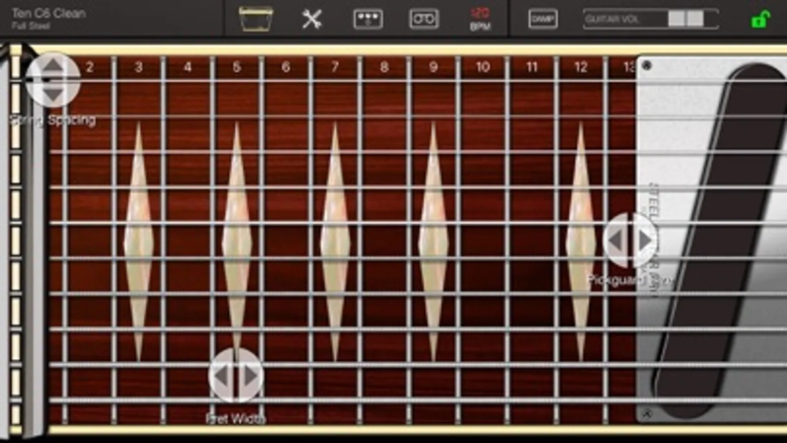 Steel Guitar PRO provides you with an arsenal of guitars to choose from: unique examples of humbuckers, single coils, P90s, and more. Instruments include many 6 string guitars, as well as 8- and 10-string steel guitar variants. Each family of instruments comes with many tuning to choose from, but you can also create and save your own. In addition, you have up to seven virtual “pedals” to bend individual or collections of string — much like a pedal steel. The pedals can be actuated by slightly tilting the device, or via MIDI, or even with the fretting touch. All of this is configurable by the user.