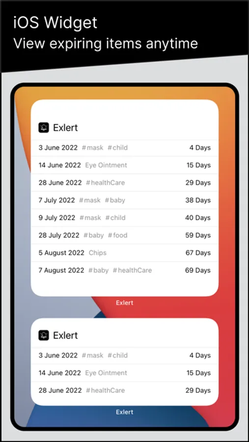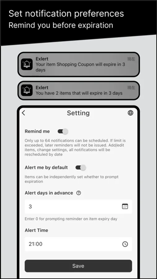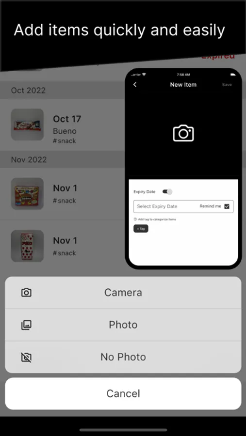 Just one photo, enter the expiration date, and Exlert will prompt you before the due date.