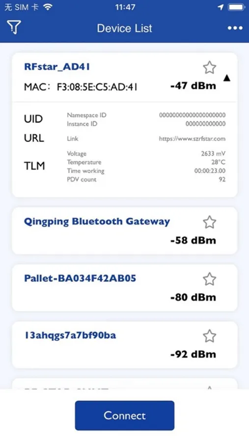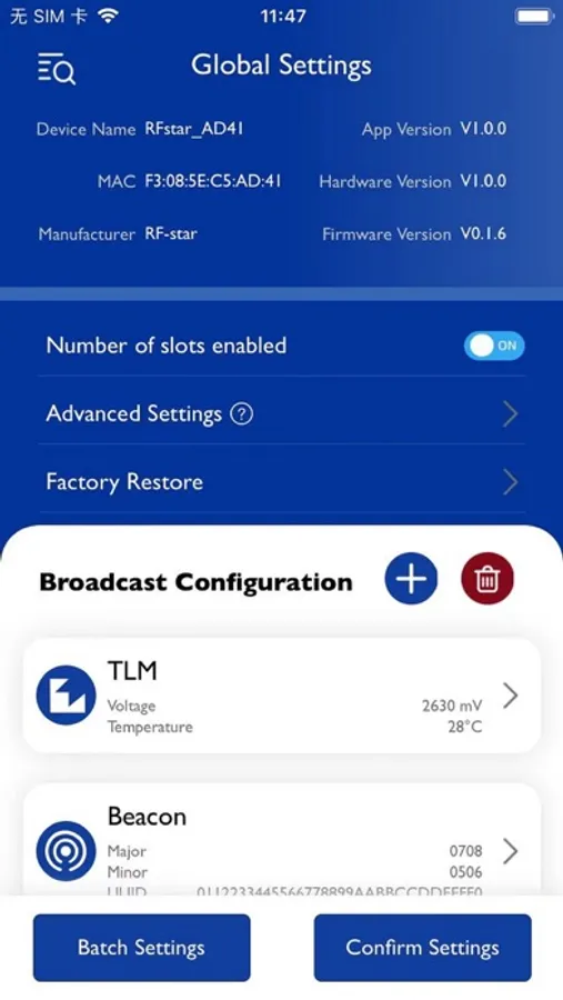 自主研发,基于室内位置定位服务的Beacon设备配置App,快速推动Beacon技术在室内位置服务的应用落地。 功能简介: 1.设备基本信息管理:查看周围Beacon设备的名称,信号强度RSSI值,UUID,Major,Minor等关键广播信息。 2.设备参数设置管理:连接Beacon设备并进行自定义参数设置。 3.设备数据格式切换:可设置Beacon,UID,TLM,URL四种格式数据参数,切换不同格式数据广播。 4.设备连接及广播设置:支持设置可连接模式和不可连接模式,自定义广播名称,访问密码设置。 5.智能筛选设备:对于周围数量繁多的设备,可根据名称,MAC地址,数据格式,RSSI值,收藏设备等进行智能筛选,提高设备查找效率。