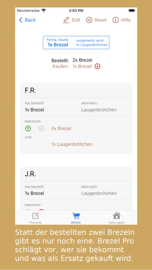 Brezel Pro verwaltet Bestellungen für mehrere Personen und gibt dabei die Möglichkeit Alternativen zu definieren. Mit einem Klick können Sie an der Theke auswählen, welche Produkte in ausreichender Stückzahl verfügbar sind, welche nicht erhältlich sind und welche vielleicht noch verfügbar sind, aber leider nicht in ausreichender Stückzahl. Brezel Pro passt die Bestellliste automatisch an und macht sogar Vorschlägen wie ein begehrtes aber limitiertes Produkt aufzuteilen ist. Wieder zuhause angekommen, sagt Ihnen Brezel Pro genau, wer was bekommt.