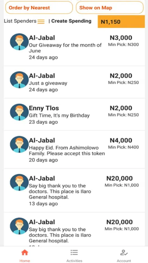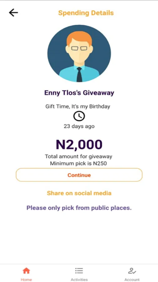Pickerpoint make give away easy by you the giver create spending(giveaway) and the receiver(picker) will come around the specific location to receive the money.