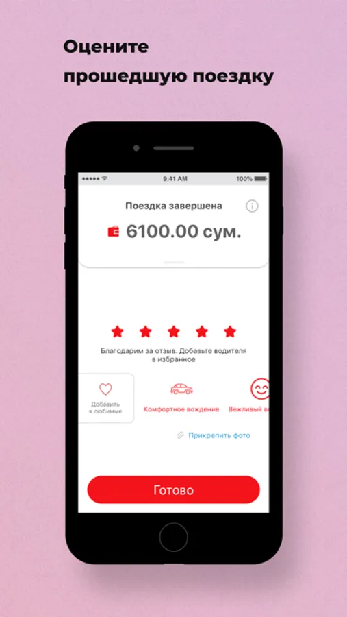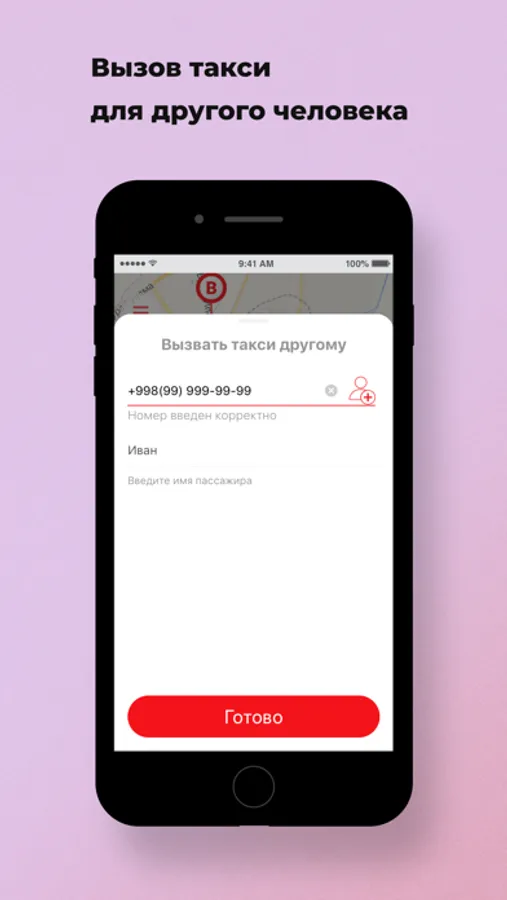 Следите за поездкой на карте. Приложение сообщит время подачи, марку, цвет, номер машины, а также имя водителя.