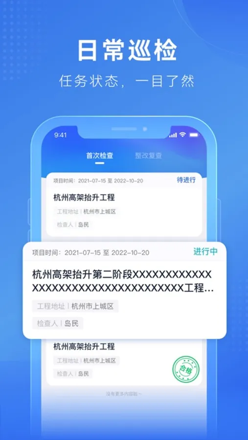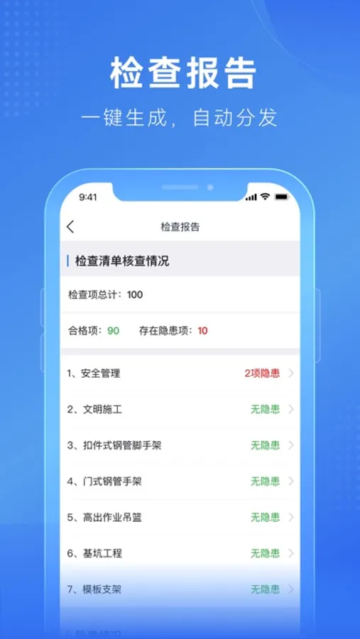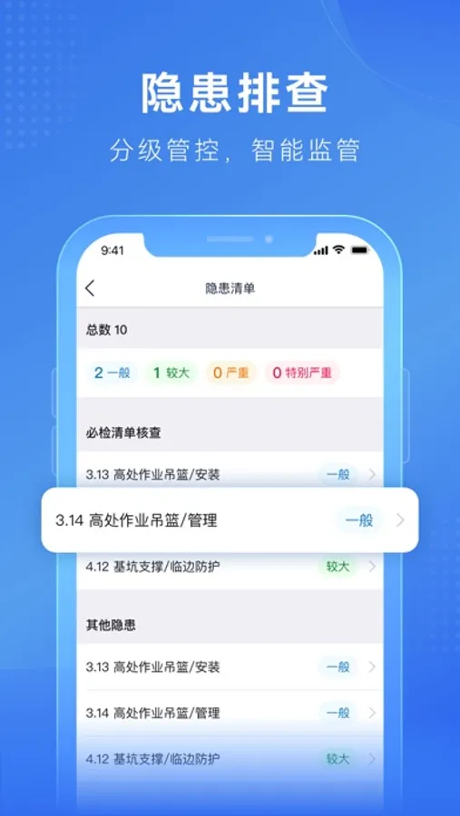 建安智管app通过监管机构、保司、三方安全检查机构的巡检服务,实现隐患排查与整改核验,通过隐患的分级管理,高效助力政府风险事故预防智能化的监管,实现政府监管、企业管理、工地巡查的线上化操作,打破信息孤岛和数据壁垒,助力实现安全生产领域“一网通办”,实现监管部门在线一站式管理功能。