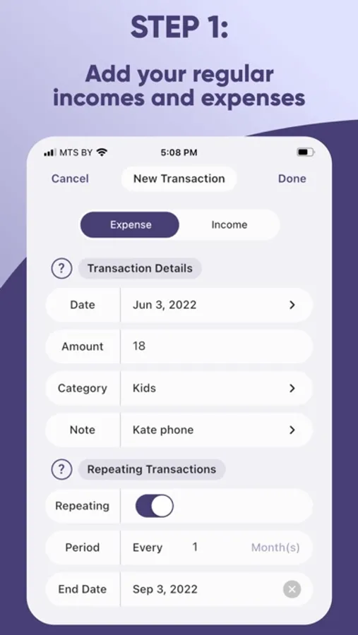 - Repeating Mode: repeat transactions daily, weekly, monthly or yearly in future