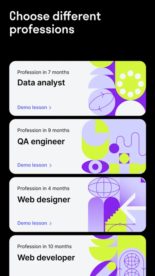 The application contains lessons on each profession, compiled in detail and as clear as possible. Inside, there are practical tasks with specific results, so you can figure things out even without experience in IT. Training is suitable for beginners.