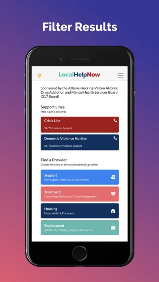 The LocalHelpNow 317 Board app is sponsored by the Athens-Hocking-Vinton Alcohol, Drug Addiction and Mental Health Services 317 Board. The app helps connect people in need of alcohol, drug addiction or mental health services with a network of behavioral health providers and recovery resources.