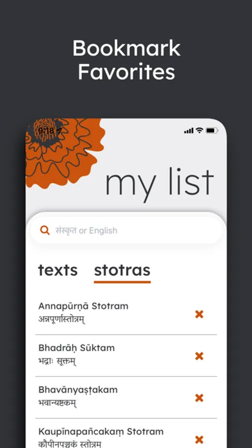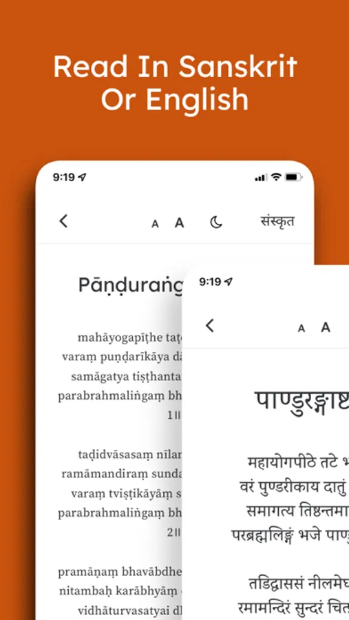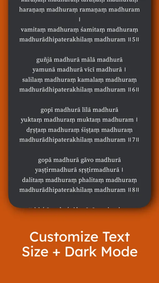 Read texts like the Bhagavad Gita, Upanishads, and Brahma Sutras and stotras like Madhurashtakam, Pandurangashtakam, and Vishnu Sahasranama in Sanskrit (Devanagari) or English transliteration.