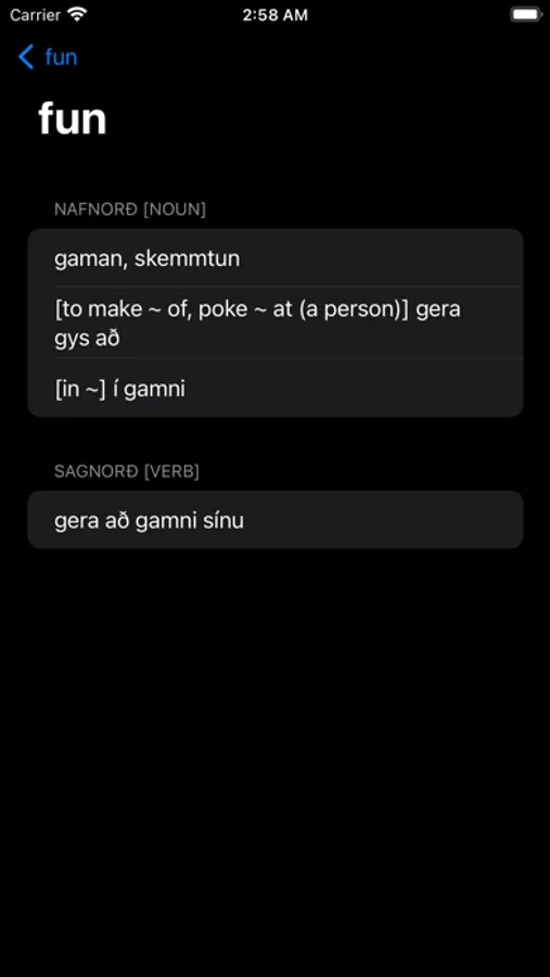 English to Icelandic dictionary, that allows looking up english words and get the Icelandic translations.