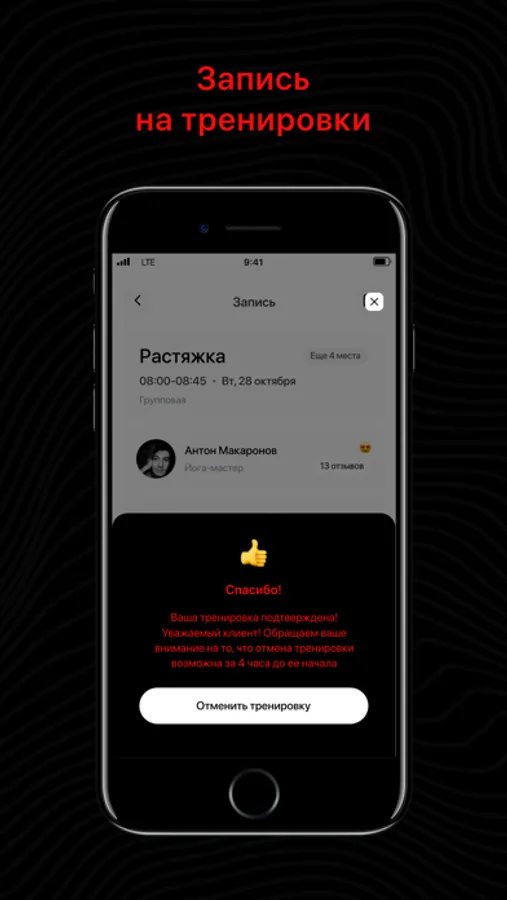 - Получать PUSH-уведомления о предстоящей тренировке за 3 часа;