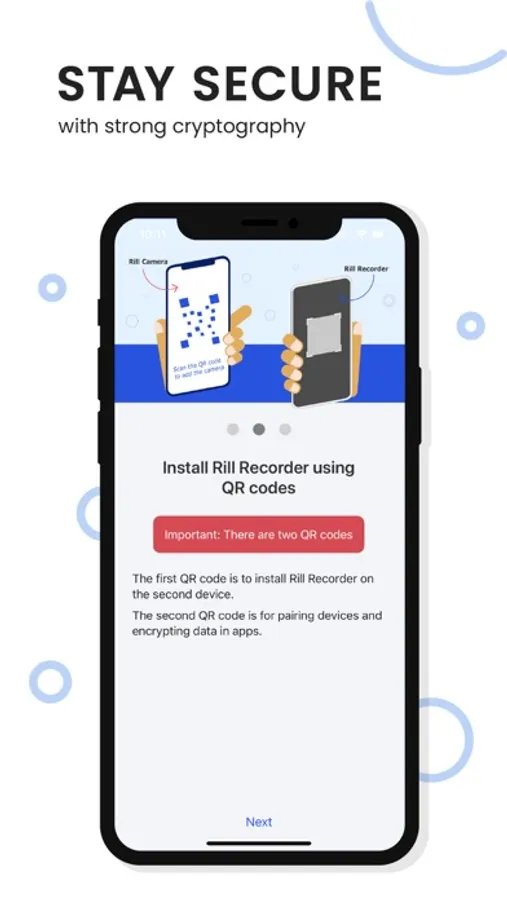 To get started, you need two devices. The first one is the primary device, where you receive notifications, watch the live view, and control the second device. The second device is for the Rill Recorder app (it is free). Pair devices with the instructions in the apps. Launch the Rill Recorder app and place the second device in a convenient place as a home security camera.
