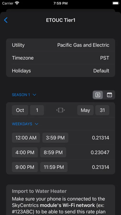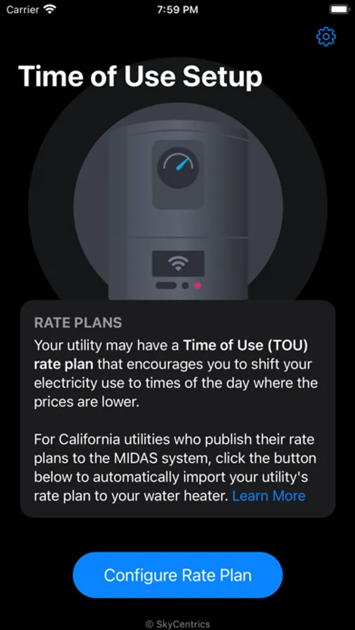 The TOU Setup app allows you to get a Time of Use (TOU) rate from a California utility and import it into your water heater so it minimizes being on at expensive times. The water heater will pre-heat itself right before the expensive time of day, and then try to avoid coming on during the expensive time of the day, unless it determines that it needs to add just a bit of hot water to avoid delivering water that is at a lower than expected temperature.