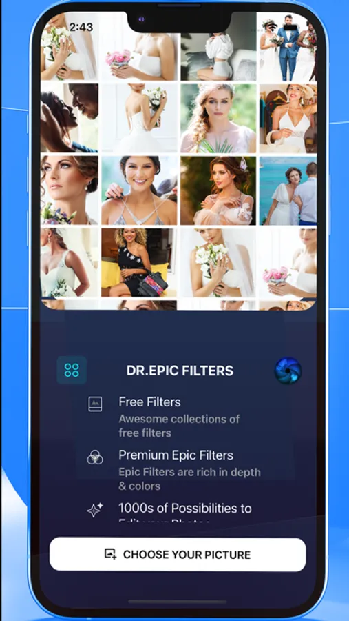 Start from selecting a Photo from your Photo Library, unlock all our custom Filters and 1000s of possibilities to Edit your Image