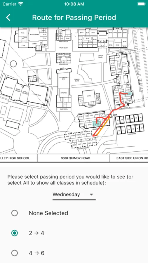 4. Viewing passing period paths: based on schedule and bell schedule inputs, you can select any passing period of any day, for which the app tells you the optimal route on a map of the campus