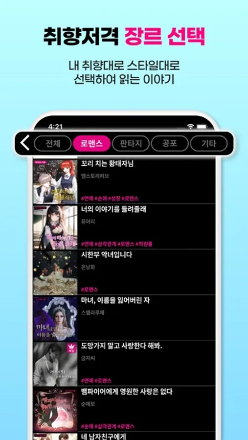⊙ 웹소설 장르 정보를 바탕으로 고객 추천 알고리즘이 반영되어 있어요!