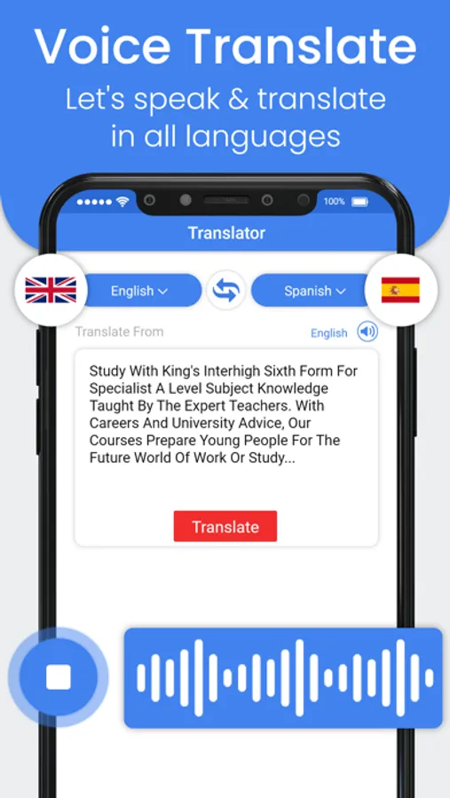 The multiple languages voice to text and text to voice translation app can use languages like English Spanish Hindi Urdu Arabic Chinese French Greek German and many more.