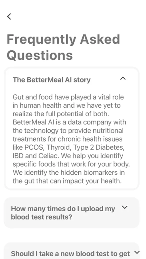 BetterMeal AI understands your gut microbiomes well and recommends what you need to eat based on your Gut health. The nutritional and gut information is unique for every user based on your existing test reports.