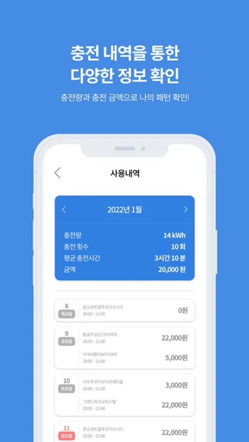 일자별로 묶인 사용 내역을 통해 한눈에 다양한 정보를 살펴보세요.