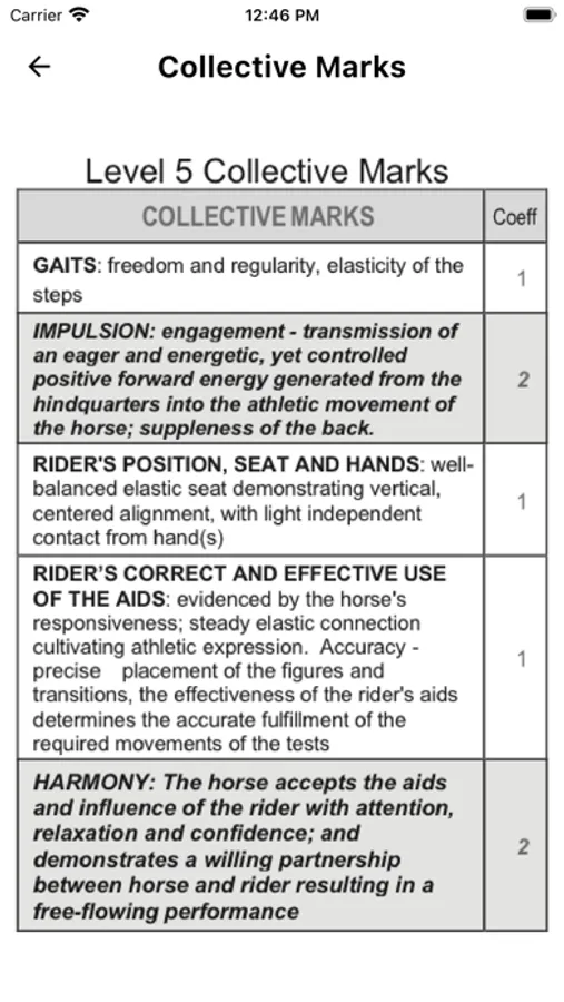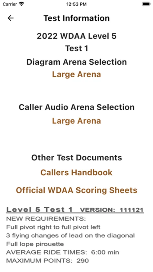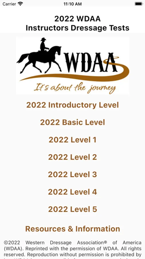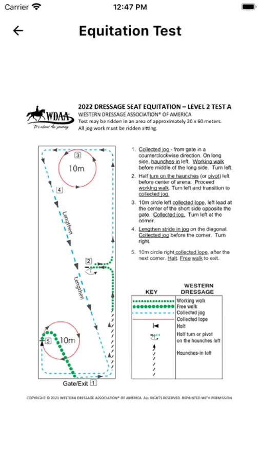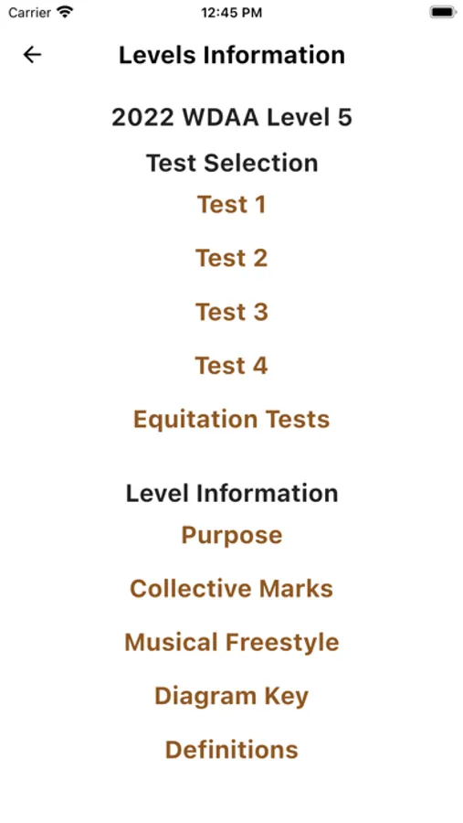 • The app provides all four tests (1,2,3,4) in a Level for the 2022 WDAA Dressage Tests Introductory Level through Level 5, Freestyle tests for all levels, and Equitation tests for Intro through Level 2.