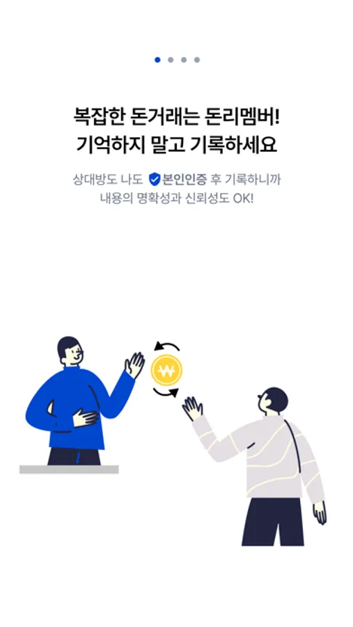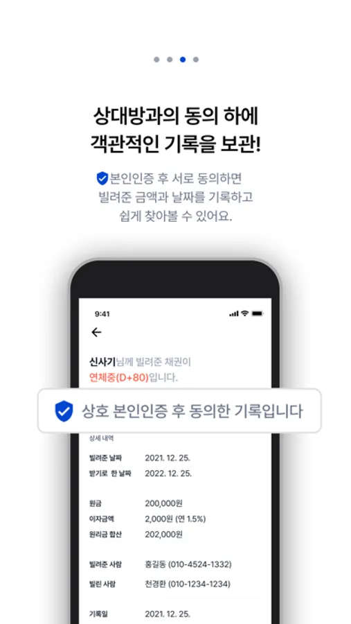 • 돈을 빌려주거나 빌린 기록을 서로 본인인증 후 남기세요. 서로 함부로 수정할 수 없는 기록이 남아 내용의 명확성과 거래의 신뢰성을 높일 수 있어요!
