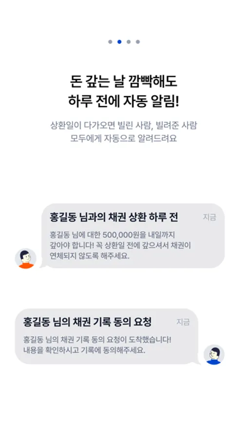 • 알림은 돈을 빌려준 사람과 돈을 빌린 사람 모두에게 전송되므로 따로 갚으라고, 또는 갚겠다고 연락하지 않아도 된답니다.