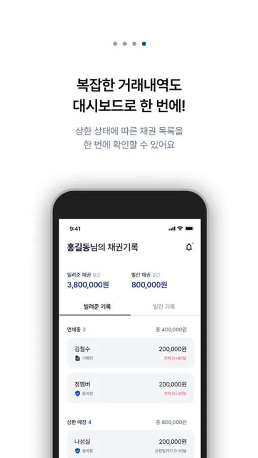 • 내가 기록한 거래의 금액과 날짜, 갚는 날, 연체 상태 등을 대시보드에서 한 번에 확인할 수 있어요.