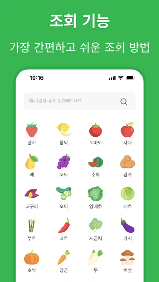 - 아이콘 기반 UI/UX로 누구나 쉽고 빠르게 작물의 경매가를 검색하실 수 있습니다.