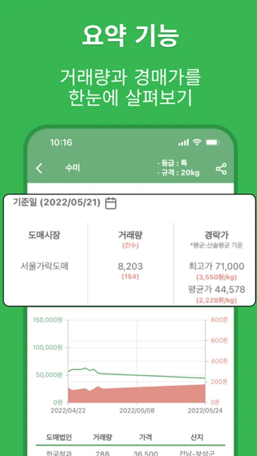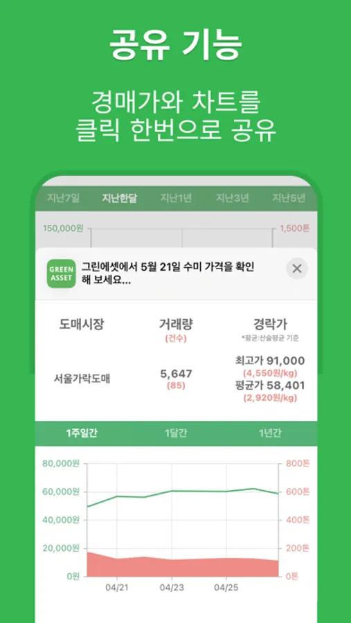 - 관심작물 경매가격 요약정보, 가격 추세 차트 정보를 빠르게 공유할 수 있습니다.