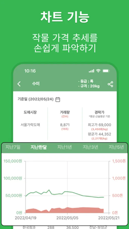 - 관심 작물의 가격 추세를 차트 형태로 한눈에 확인할 수 있습니다.