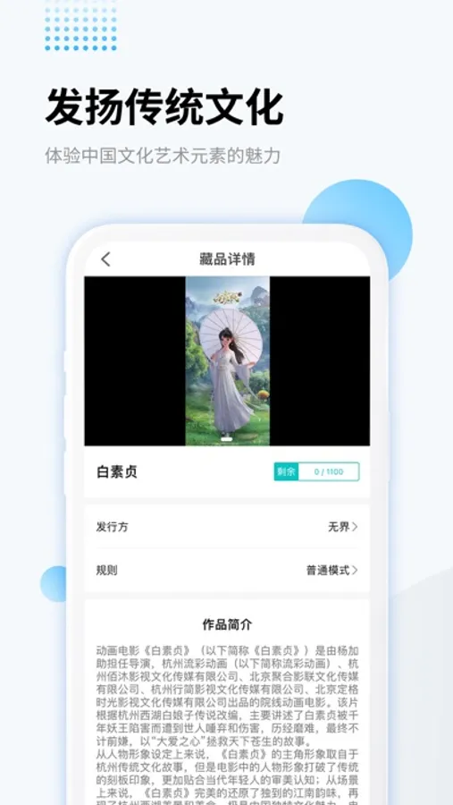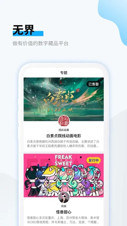 无界数字藏品是集数字藏品授权、IP运营、数字衍生品发行为一体的元宇宙开发平台。让艺术文创行业优秀的创作公司及创作者的IP、作品生成数字藏品,连接至元宇宙虚拟世界,同时连接喜爱他们的粉丝。无界涵盖影视、动漫、电影、艺术、以及快消品、电影票、门票、艺术品、文化衍生品等等。用数字藏品生成一个证明,在虚拟世界中使用。打造完整的数字藏品发行、虚拟数字人创作、元宇宙开发的元宇宙产业生态链。