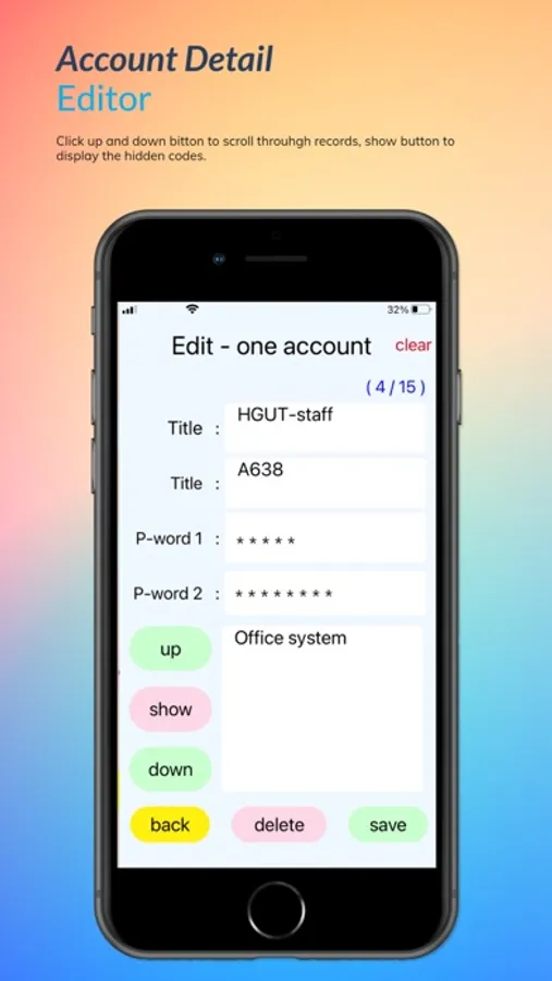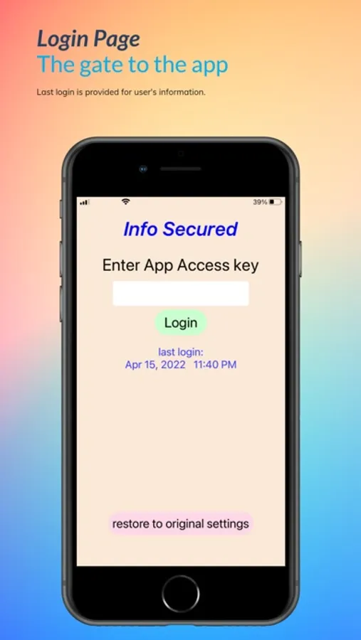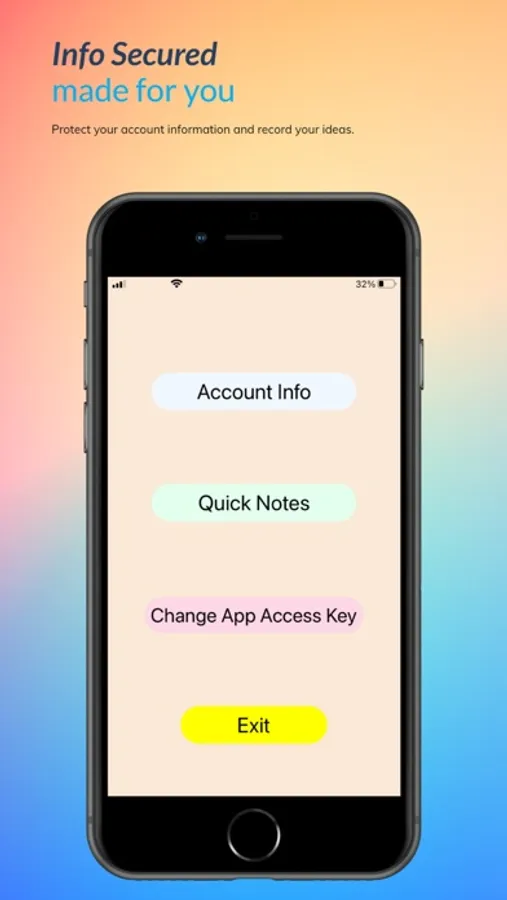 The app, Info Secured, provides two functions, account info and quick notes. Account information runs like a protected data book keeping all account data in detail. Quick note is just as its name for easy notes. The app takes 2 measures to protect user’s information and keep user in charge. One measure equips the app with a login page. The other measure activates timer to put the app at a secured state.