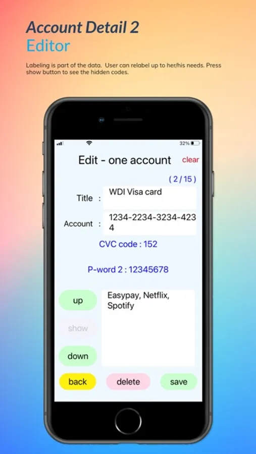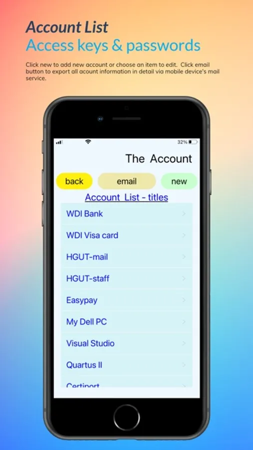 The entry of Account info function is a list view of the titles of all recorded accounts. User chooses an item to edit an existing account or clicks “new” button to add a new record.