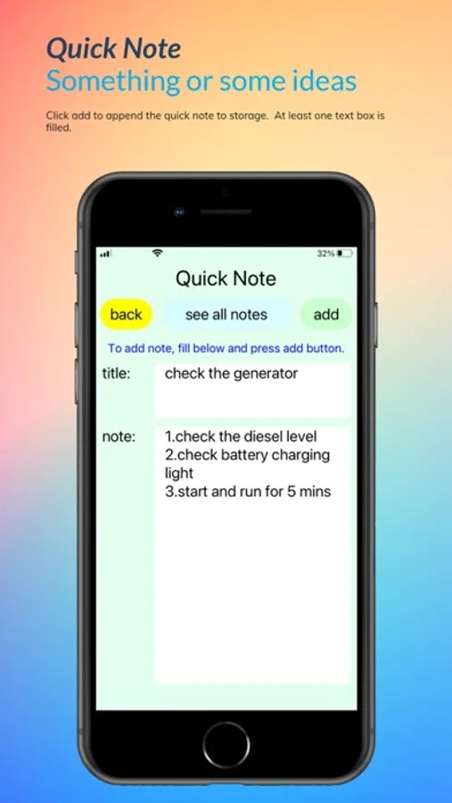 The entry page of Quick notes function is an editing page for user to add notes. There are 2 text boxes in the page. To save a note, at least one text box is filled. When “add” button is pressed, the app appends quick note to memory without screening. That is no key value is involved.