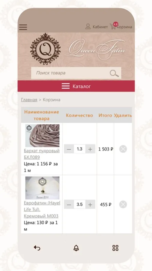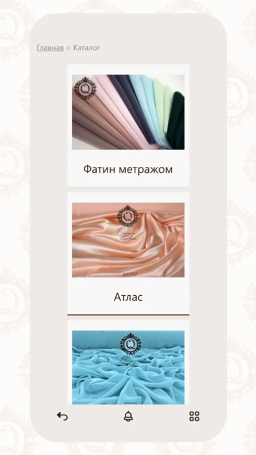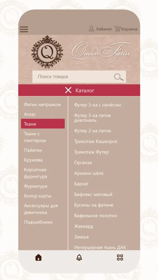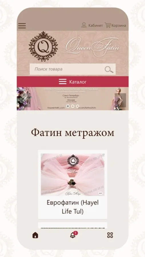 В приложении QUEEN FATIN удобно просматривать весь ассортимент наших тканей. Благодаря приложению вы всегда будете в курсе наших спецпредложений, не пропустите дни распродаж и своевременно увидите поступление новинок!