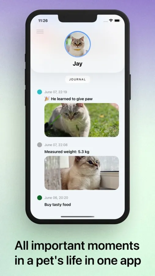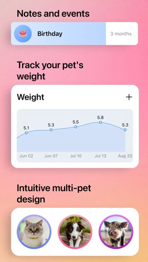 We have taken care of the owners of several pets. Swipe on the screen, switching between your furry (or not) friends.