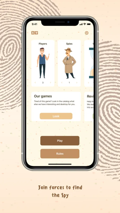 Spy is a fun conversational board game. You only need a smartphone with the game installed and a company of three people. The more you will be, the more difficult and interesting it will be to play.