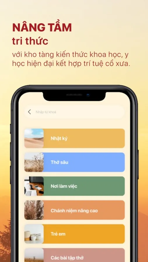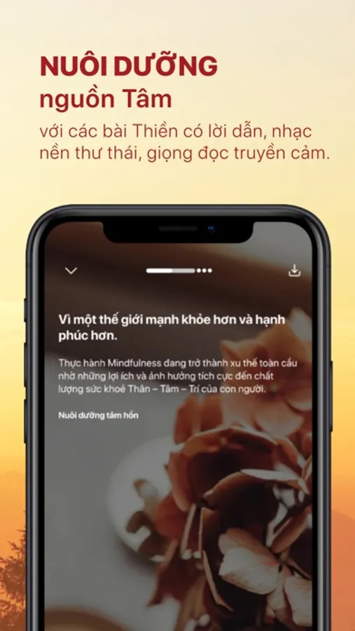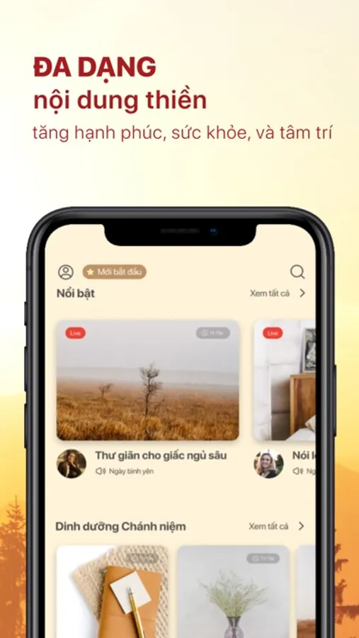 - Giao diện trang chủ tiện dụng Tìm kiếm, truy cập dễ dàng vào những nội dung mà bạn quan tâm: Thiền, vận động, yoga, giấc ngủ, khai sáng. Trang phụ gồm các nội dung: truyện cho bé, dinh dưỡng, âm nhạc, cha mẹ.