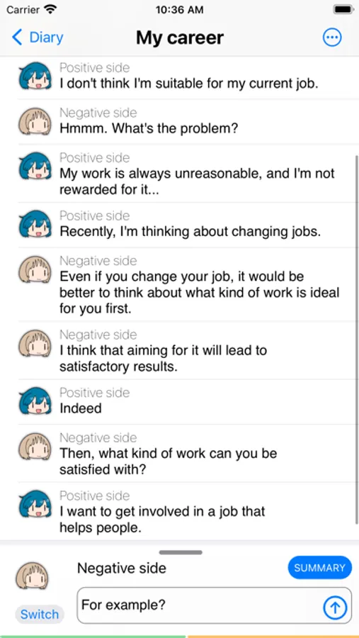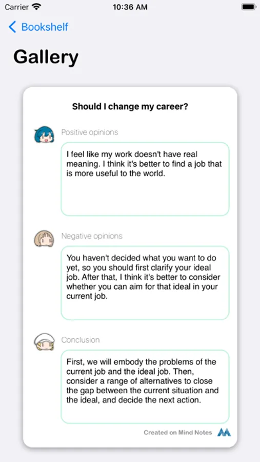 In Mind Notes, you can discuss with yourself. You will see two projections of your mind. One is "Positive" that expresses your natural feelings. The other is "Negative", a little suspicious and asks a lot of questions. It will also suggest alternatives.