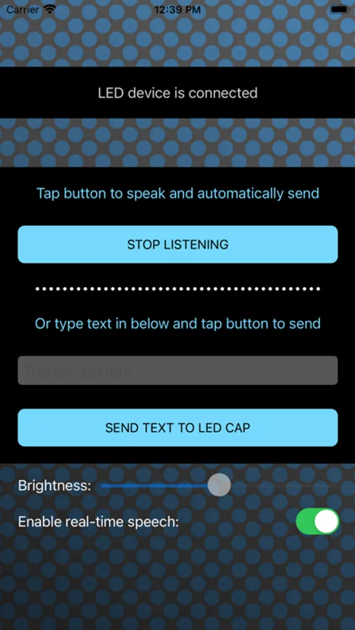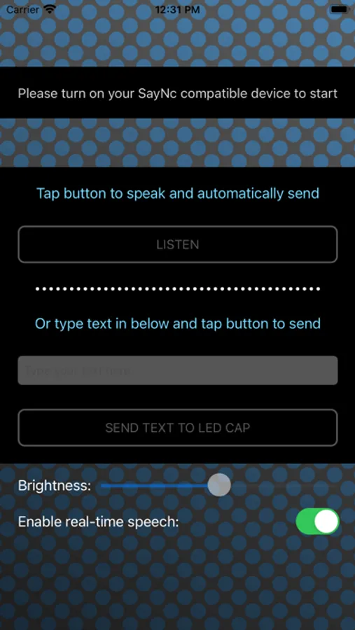 SayNc allows speech recognition to be transmitted to LED screens built into ArticuLED masks, hats, signs and badges. The app features 2 modes, real time transcribing that displays each word as it is spoken, or sentence transcribing that allows a group of words to be displayed then continuously repeated. Other features include a display brightness that allows longer battery life and a manual send text mode.