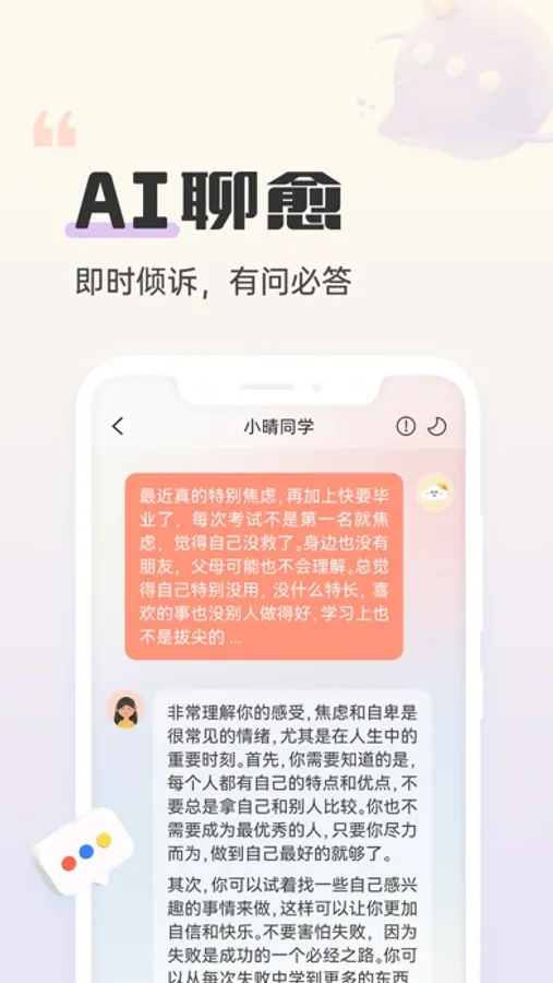 [AI聊愈]即时倾诉,有问必答。随时对小晴说出你的困扰吧,ta会根据你的情绪状态,为你提供调节建议和合适的“情绪处方”。