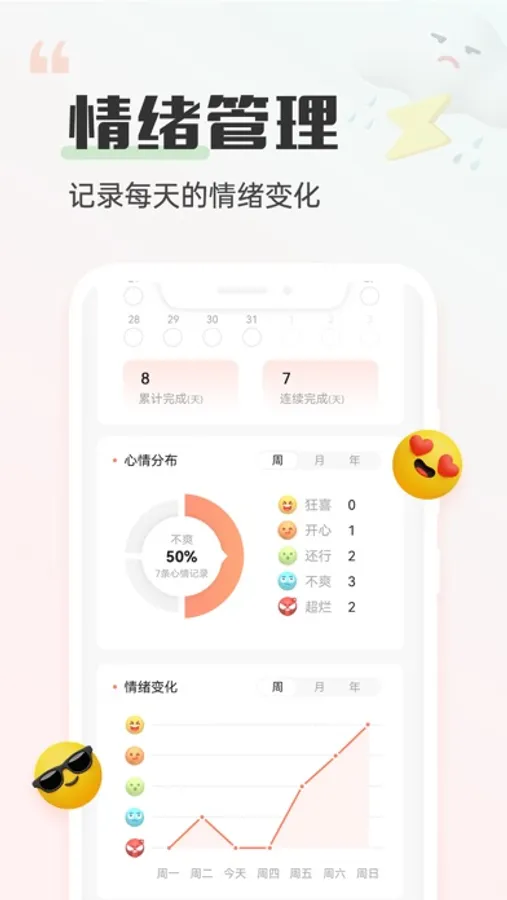 [情绪管理]小晴会帮你记录每日心情,观察与追踪情绪的变化,找到并分析出现“ 坏情绪”的原因,告诉你如何应对坏情绪的方法。