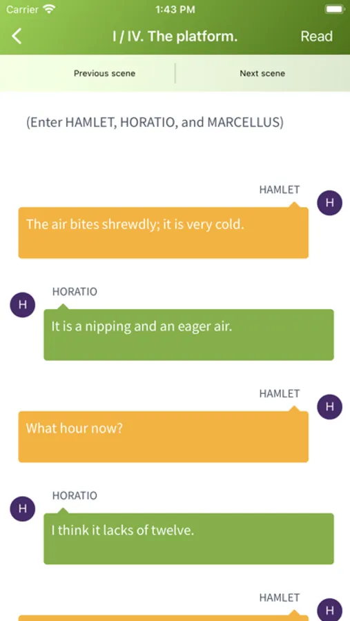 Using Text to Speech, Scene Steeler will read the other roles and pause for you to say your lines. You can start by just reading them from the screen, then once you know them, blank them out and listen for the playback to see if you got them right. If you're stuck, just double tap to reveal your line.