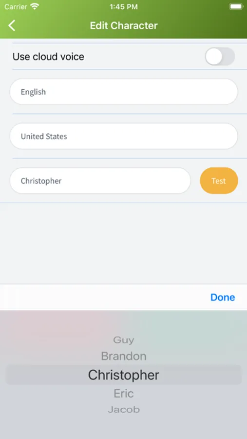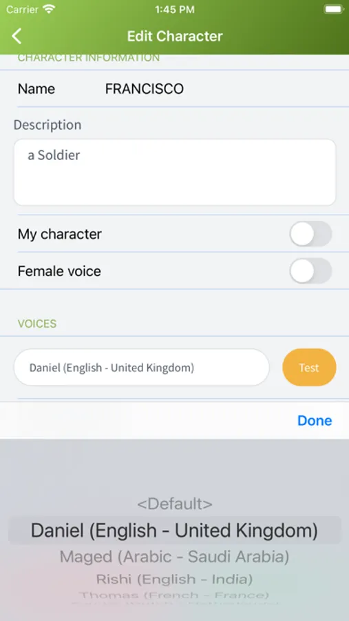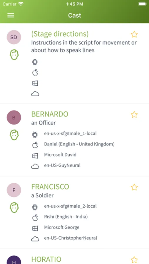 Select which voice to use for each character, in the device's text to speech engine, or a Neural Cloud voice (internet connection required)