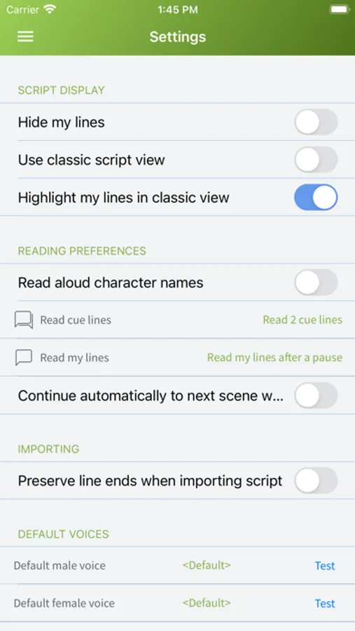 Lots of options let you use your time effectively. You don't have to listen through dialogue that doesn't involve you - tell Scene Steeler to just read a couple of cue lines before each of yours. Select a different voice for each character, or get Scene Steeler to read out the name of each character before his or her lines.