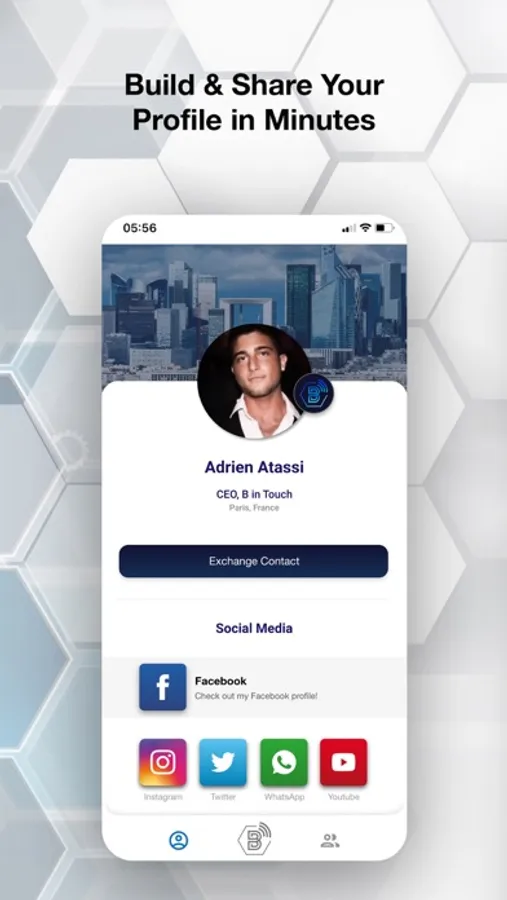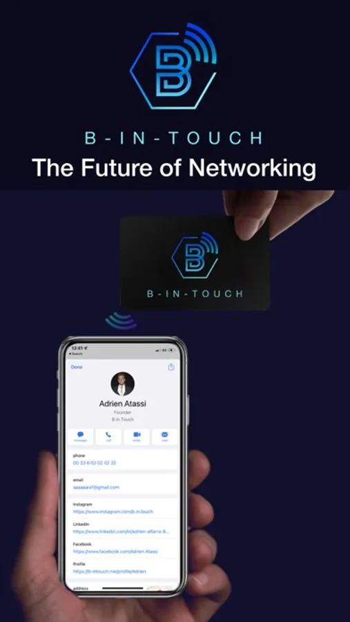 With a simple tap of your B in touch device, or scan of your B in touch QR Code, you can instantly share your contact info, social media profiles, files, links, and more. Plus, the other person doesn't need an app receive your info.