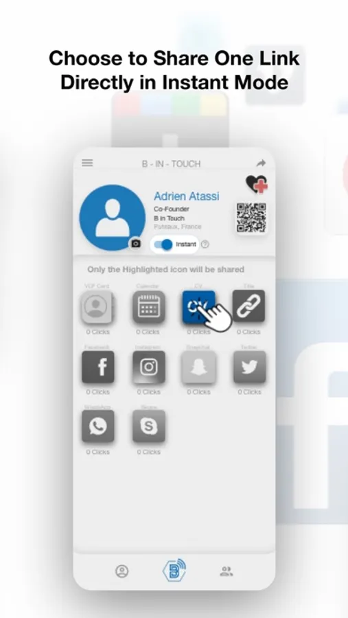 - Don't want to share your entire profile? Turn On B in Touch Instant Mode to share your Instagram, LinkedIn, contact card or any other link, directly and instantly.