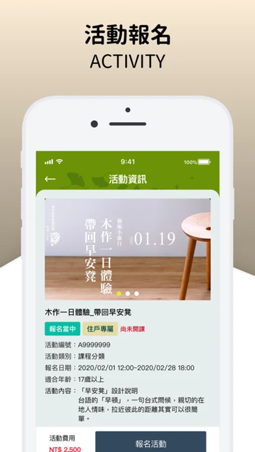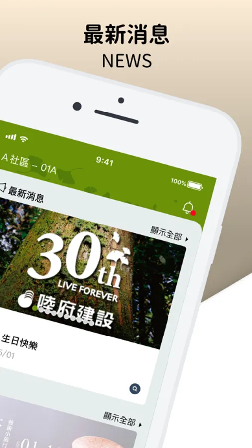 活動報名、工程進度、繳款進度、修繕追蹤、群組通訊等多項功能,統一整合資訊,輕鬆享有陸府式自然生活!