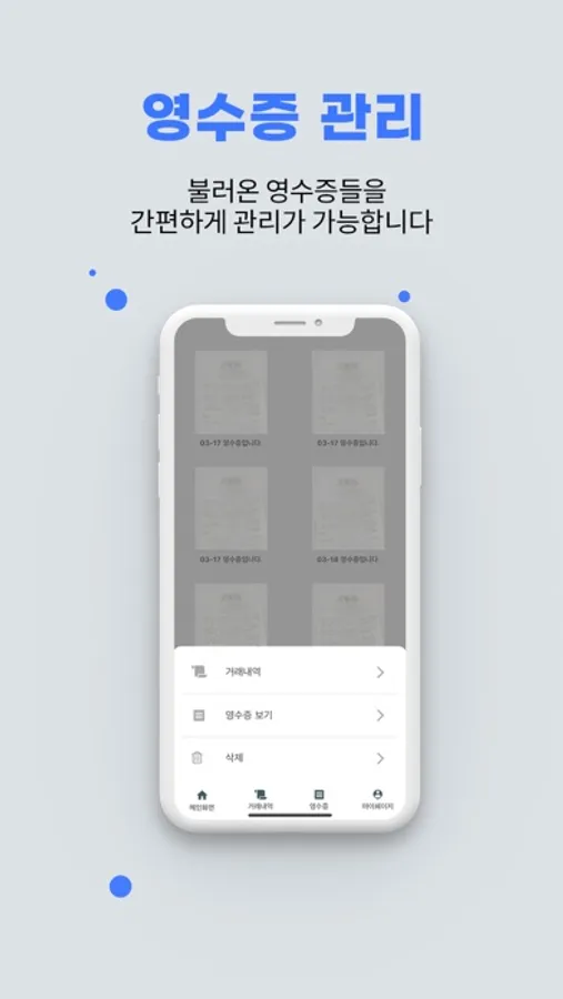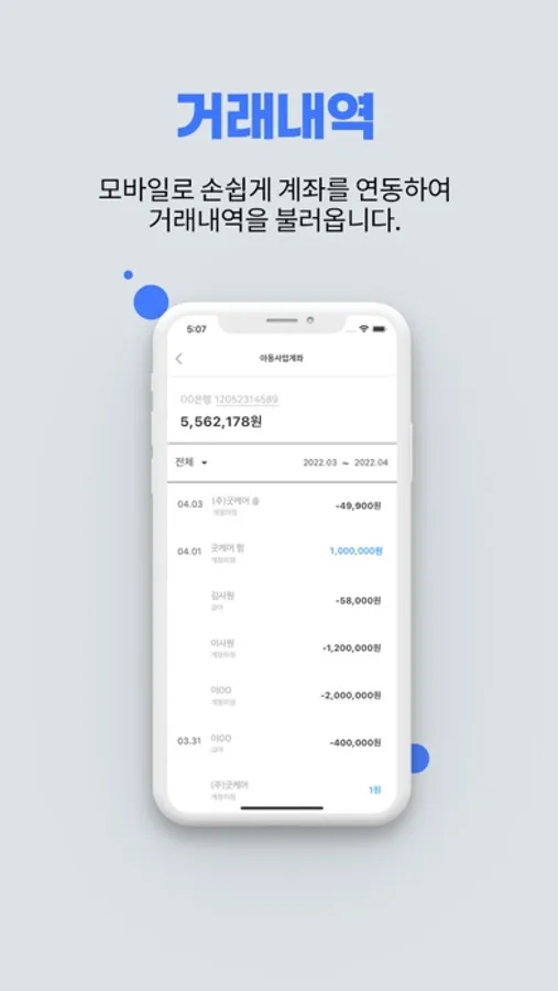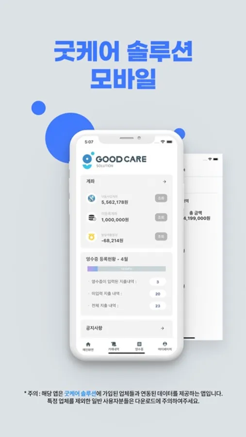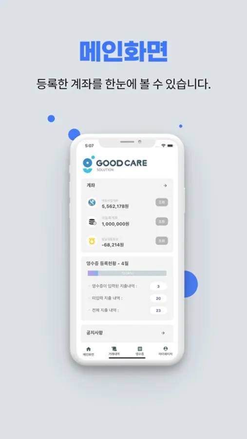 굿케어 솔루션을 이용해 계좌를 연동한 고객은 앱을 통하여 간편하게 거래내역 확인 및 영수증 등록을 할 수 있습니다.
