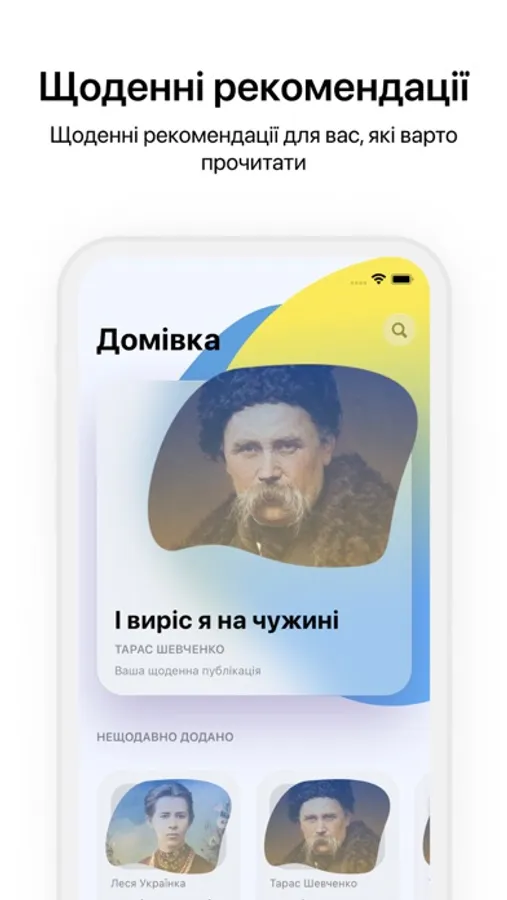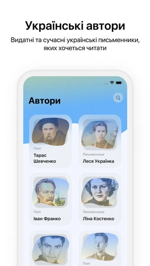Отримайте доступ до віршів видатних діячів української культури: Тарас Шевченко, Леся Українка, Іван Франко, Павло Тичина, Володимир Сюсюра, Василь Стус, Ліна Костенко, Андрій Малишко та багато інших авторів, які розміщуватимуть твою творчість на мобільній платформі Моя Вкраїна.